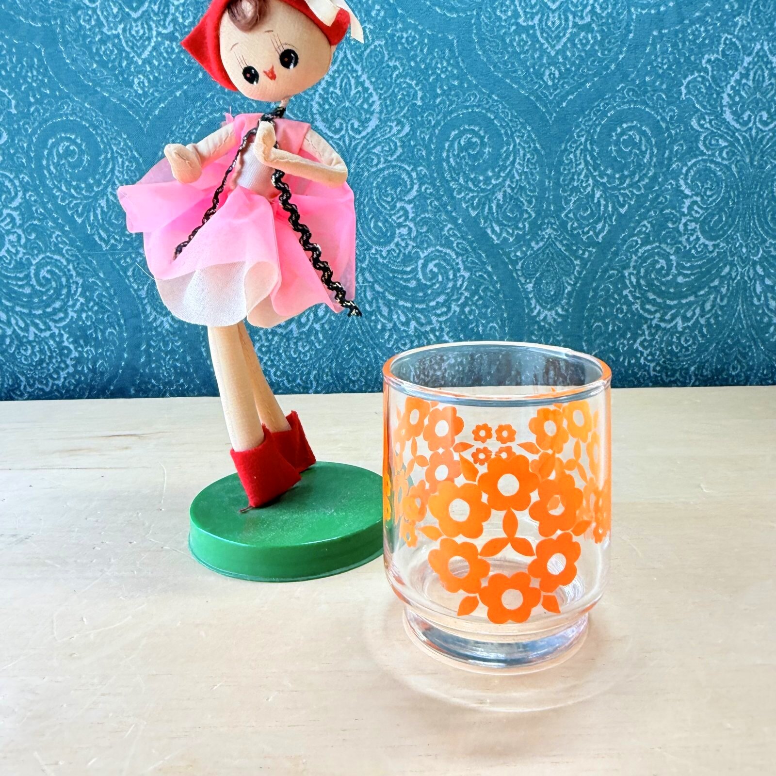 レトロポップでかわいいオレンジの花柄グラスです