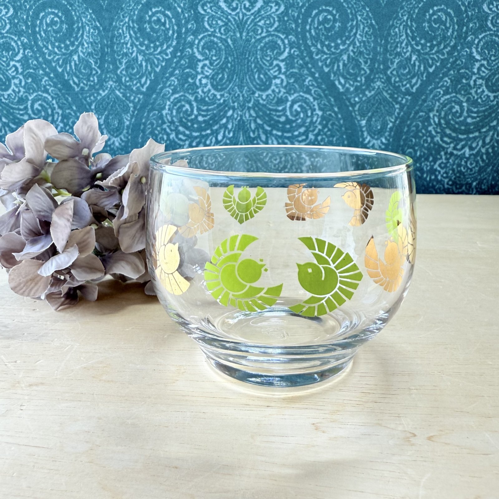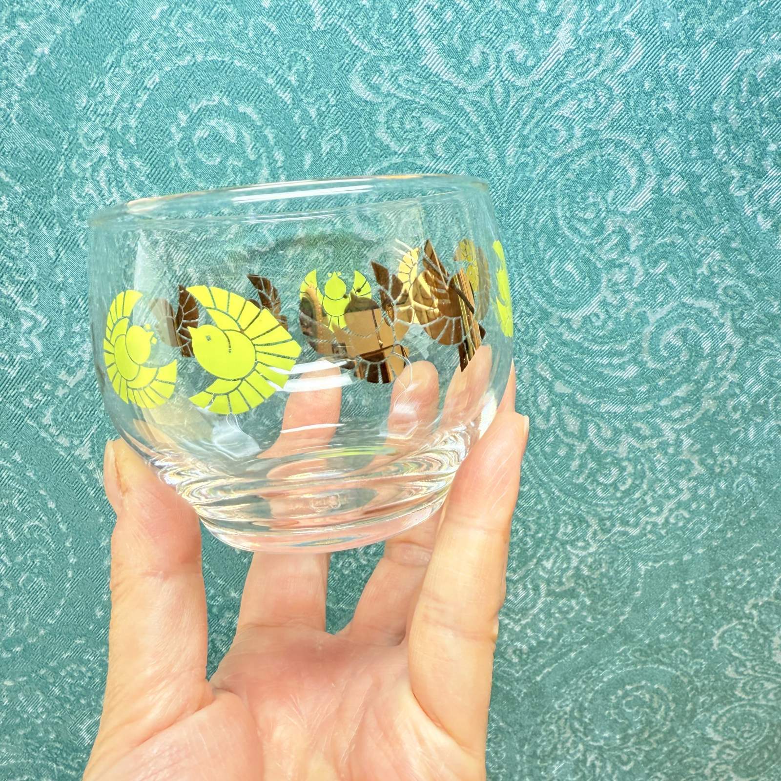 金と緑の鳥が飛ぶグラス