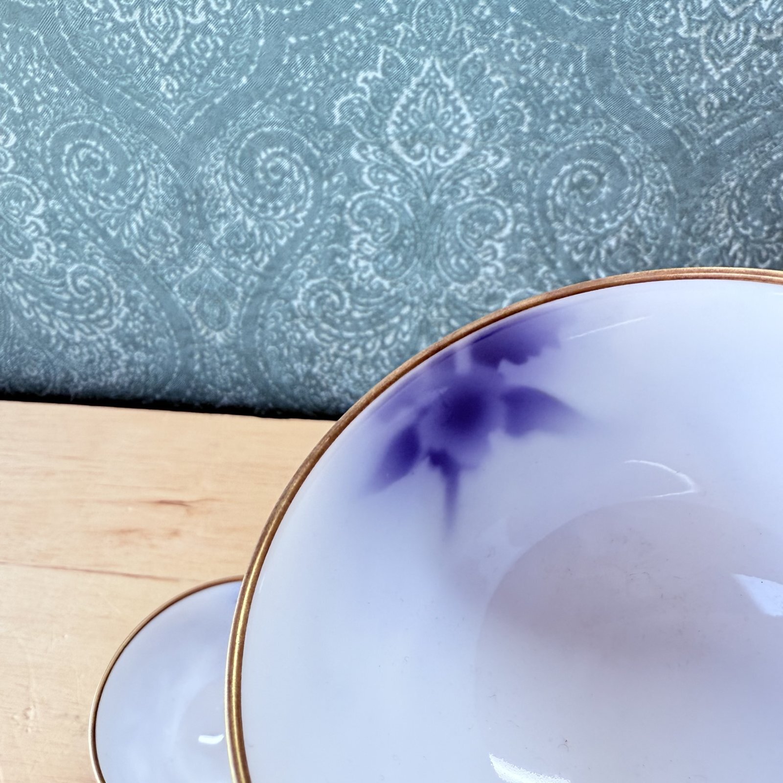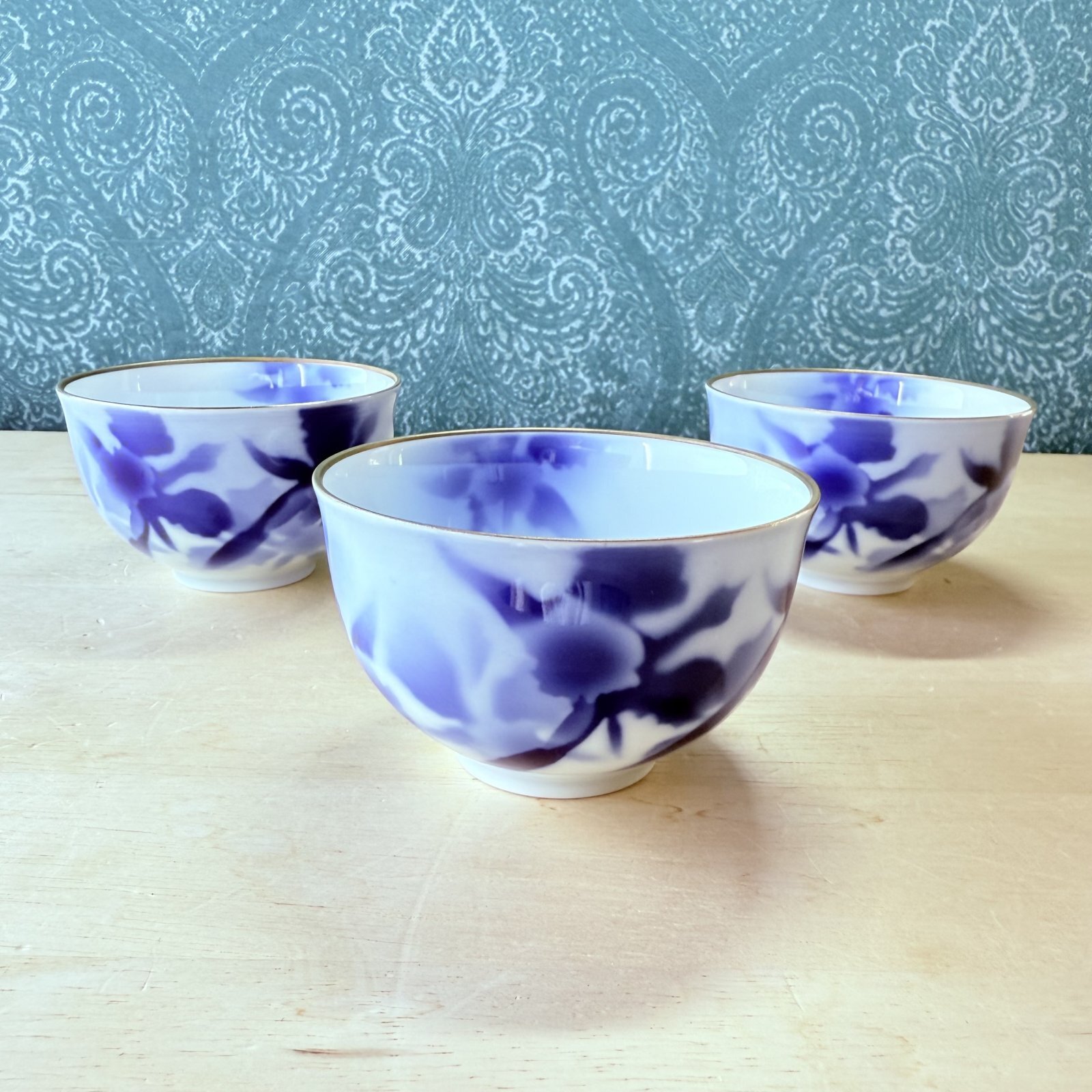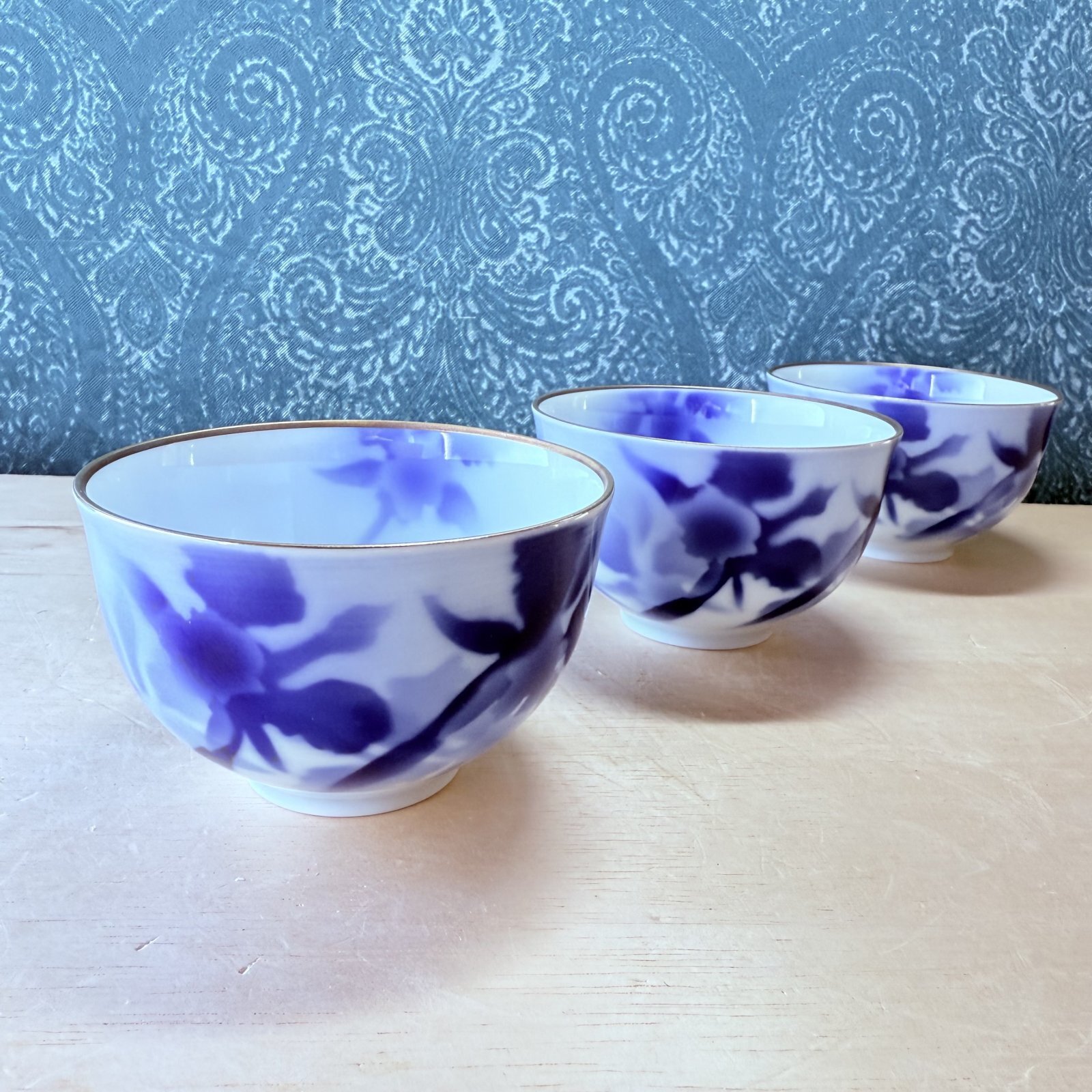 美しい藍色のぼかし技法と、縁の金彩が特徴です。